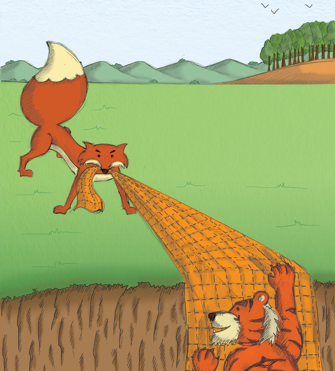 In one story a fox and a tiger are friends. The tiger falls into a hole.